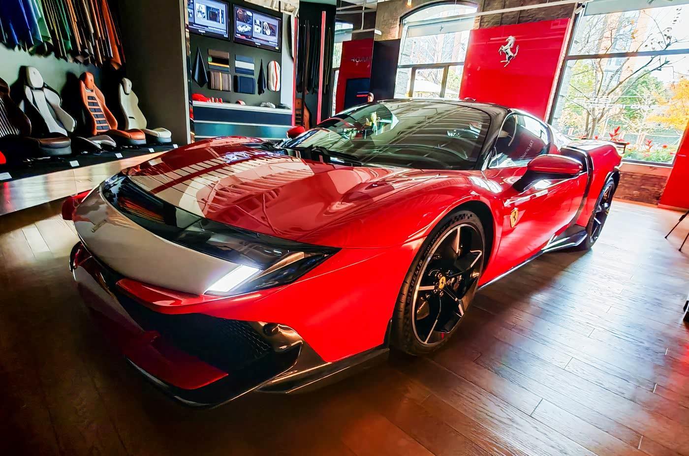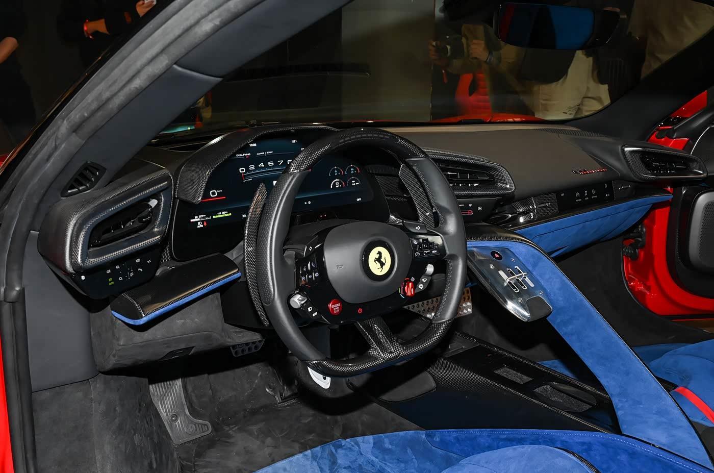 进入车内,内饰融合单座赛车的水平仪表盘与座舱设计,铝质边框勾勒出C形悬浮出风口,中控区域采用类似旗舰F80的简约布局,帆形面板整合换挡机构与控制按钮,操作直观且贴合驾驶需求。方向盘保留经典实体启动按钮,集成eManettino驾驶模式旋钮,可快速切换纯电、混动、性能、排位赛四种模式,仪式感拉满。作为2门2座跑车,座舱空间聚焦驾驶者体验,提供舒适型与碳纤维赛车座椅两种选择,前者兼顾长途支撑性,后者以高强度侧向支撑适配赛道驾驶。车内搭载丰富驾驶辅助系统,包括自适应巡航、自动紧急制动与车道保持功能。