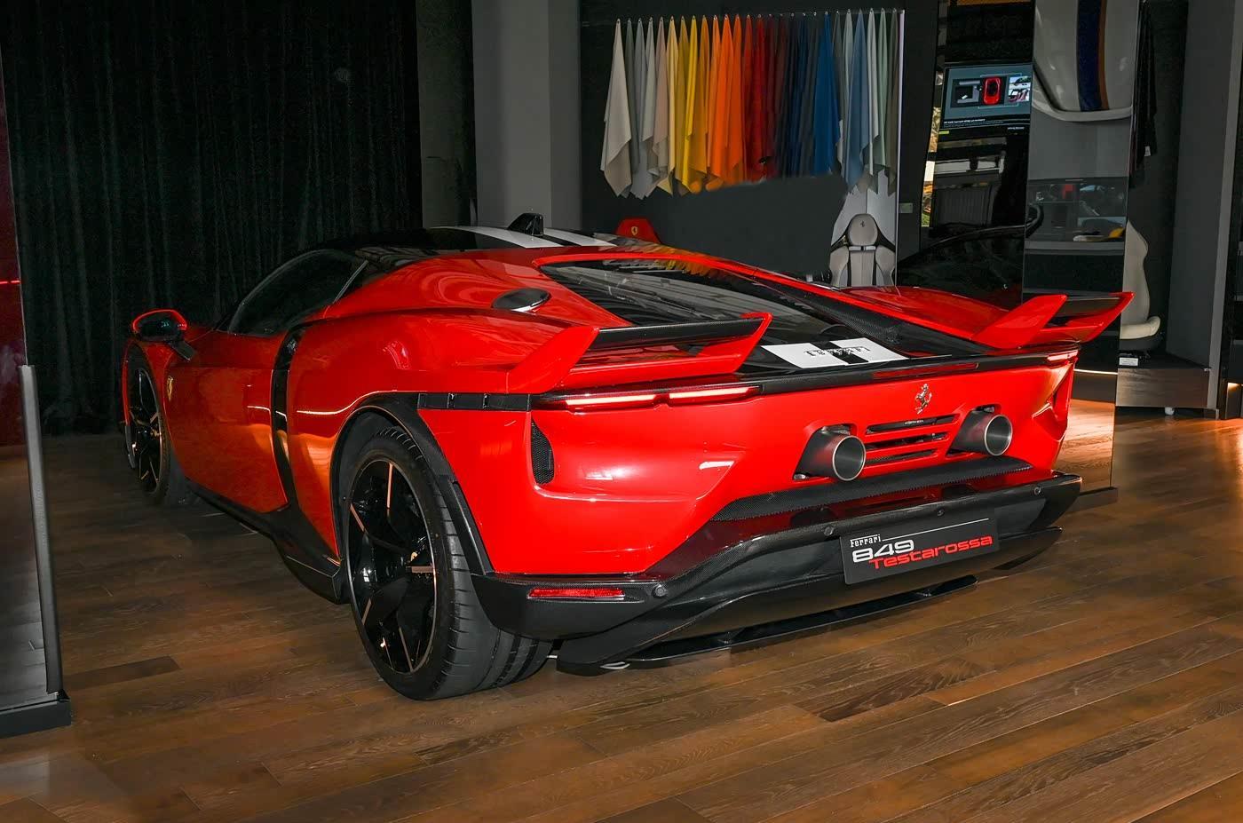 再来看车尾部分,车尾设计是849 Testarossa空气动力学的集大成者。源自法拉利512 S赛车的双尾翼结构,底部的扩散器采用多层次设计,配备悬浮式元件与垂直导流板,有效隔离轮胎尾流,而双边排气管与硬朗的后包围造型,既延续了经典Testarossa的硬核风格,又通过优化气流通道降低了风阻系数。